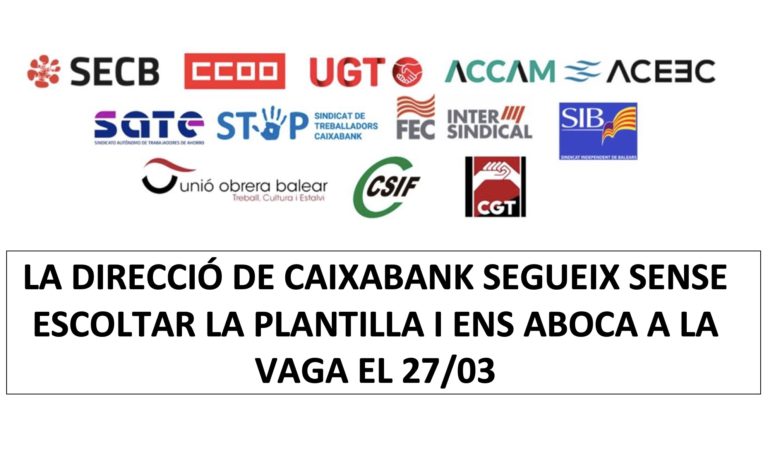 Dimecres 18 de març de 2026 Les organitzacions sindicals que conformem la Representació Legal de les Persones Treballadores (RLPT) a CaixaBank hem convocat la Vaga